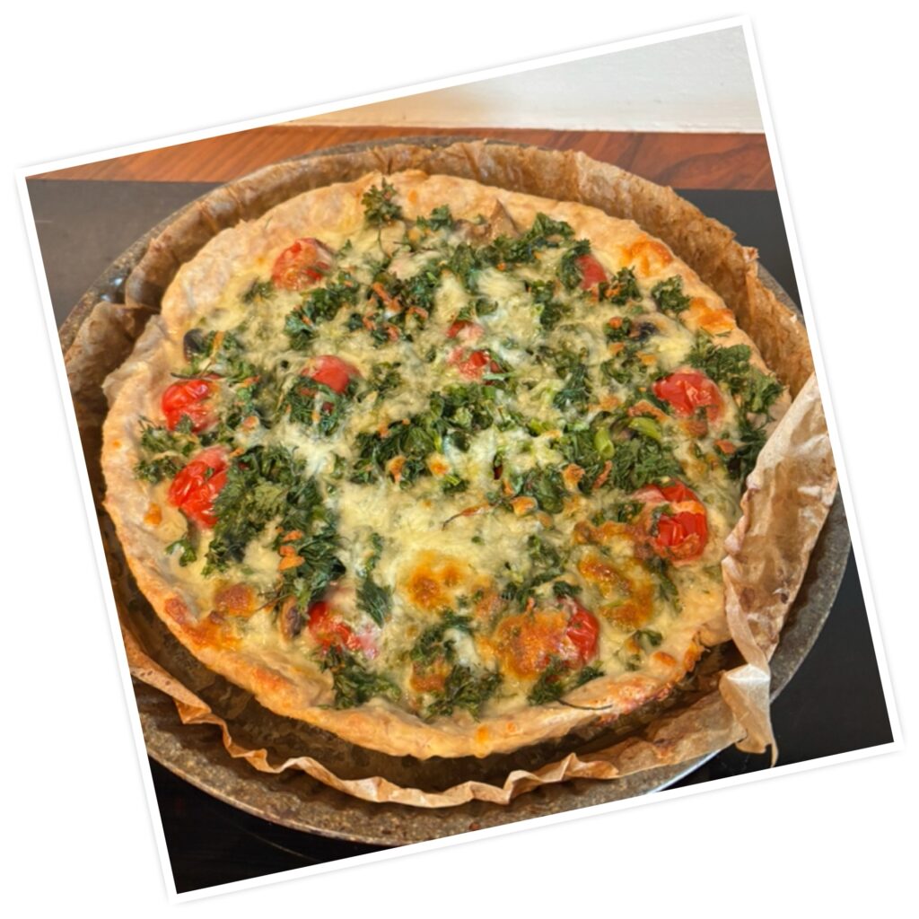 Куриный пирог — сытное блюдо с белковой основой из куриного фарша и творога. В качестве начинки можно использовать любые овощи по вкусу. В данном варианте — шампиньоны, шпинат, томаты черри и сыр под ароматной зеленью.